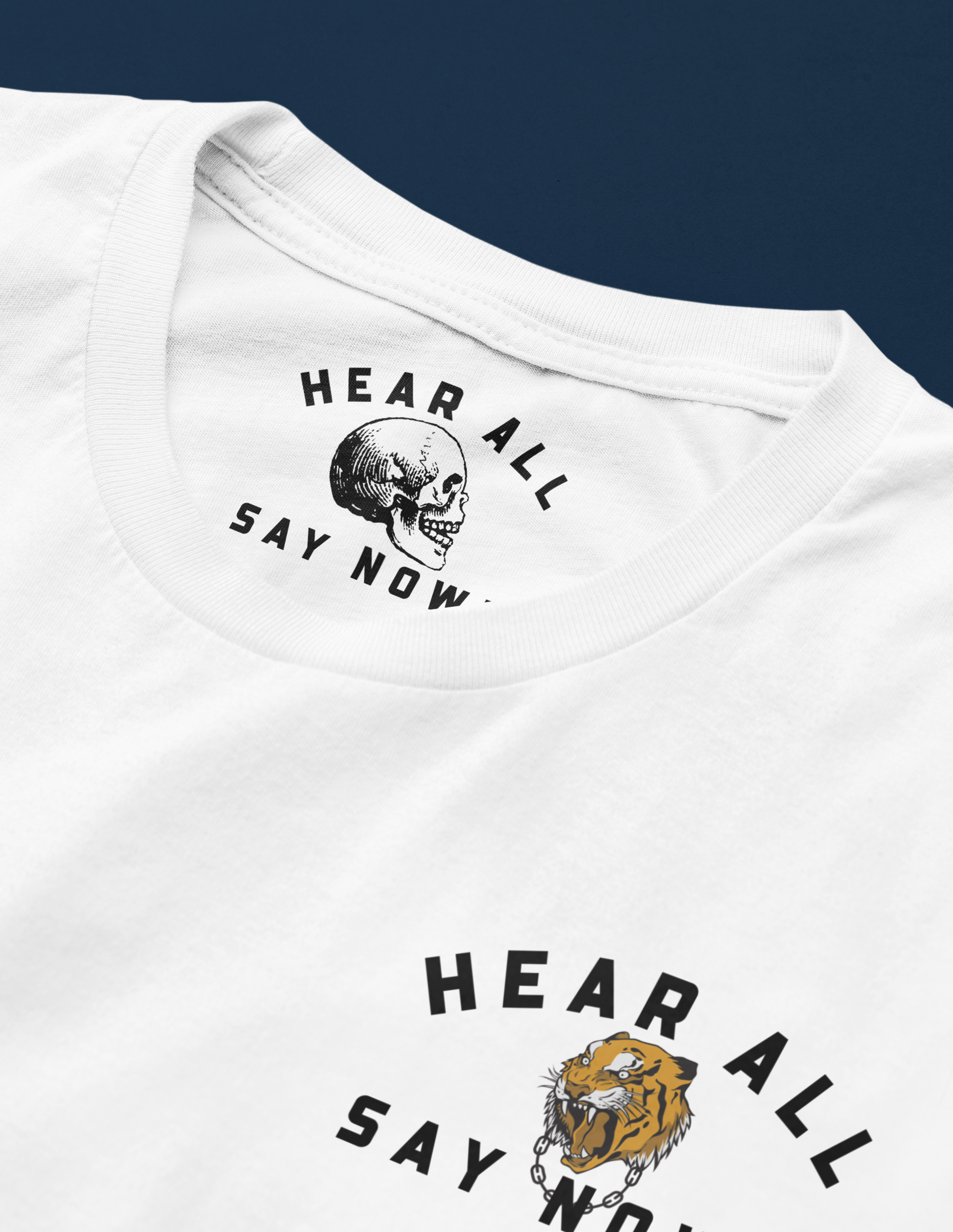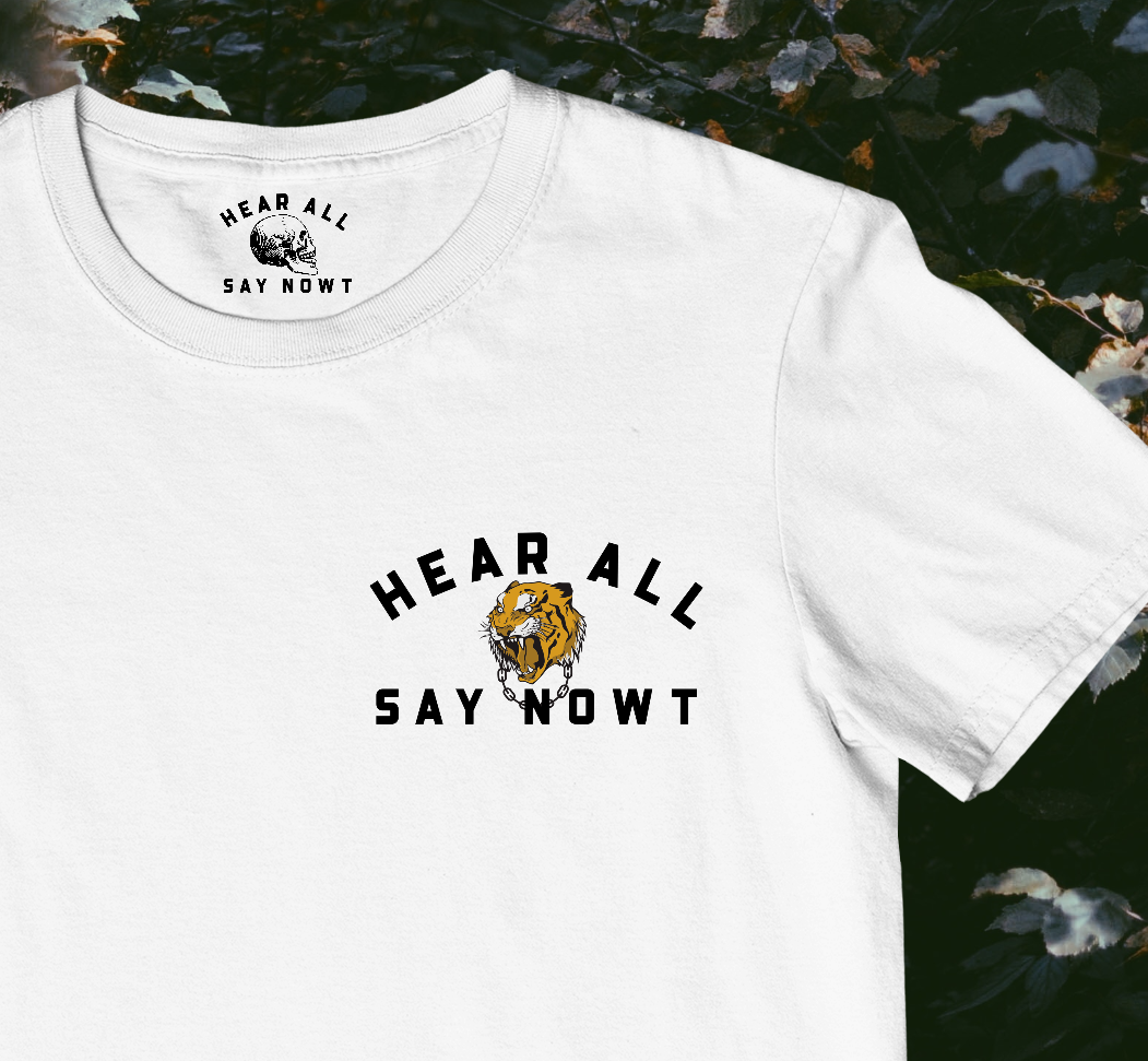 -HEAR ALL SAY NOWT Tattoo inspired TIGER artwork professionally printed to the front left chest.